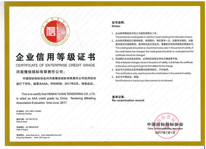 中國招投標協會3A企業信用等級證書